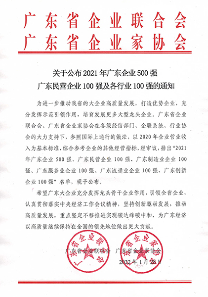 The lists are intended to promote high-quality development of large enterprises in Guangdong Province, to construct superior enterprises, to give full play to the role of demonstration and leadership, and to foster and develop more large leading enterprises. Therefore, the ranking of Guangdong Top 500 Enterprises has established the image of benchmark enterprises and carried forward the entrepreneurial spirit. These enterprises are the industry leaders, important pillars and models of Guangdong economy.