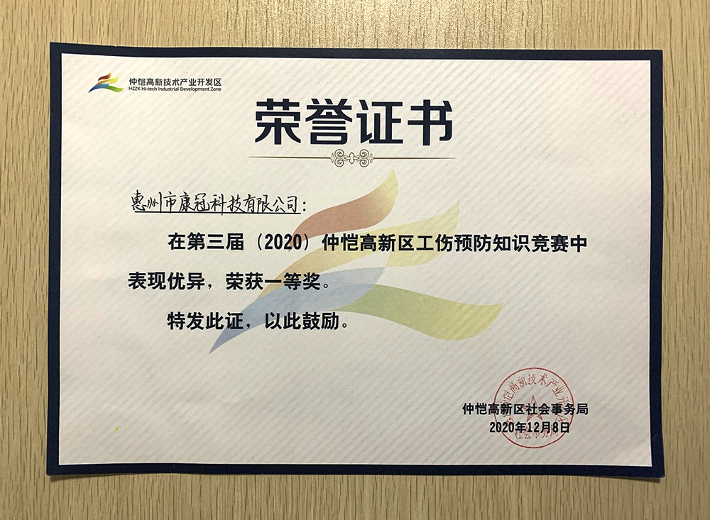 El 7 de diciembre, se inauguró el III Concurso de Conocimientos sobre Prevención de Lesiones Laborales de la Zona de Alta Tecnología de Zhongkai (2020) en el Edificio de Servicios para Talentos. KTC designó un equipo formado por tres colegas del Departamento de Recursos Humanos: Shi Ruiqi, Luo Zhiyuan y Xue Ji, el cual asistió al concurso, y ganó el campeonato con resultados excelentes.