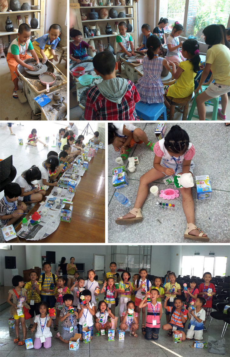 下午,小朋友们分成了两组,一组到悠悠淘艺坊DIY淘器,另一组则到培训室做淘瓷彩绘。在陶艺坊,小朋友们跃跃欲试,纷纷围上围裙制作自己想要的陶器,在师傅的指导下,一个个可爱的杯子、花瓶、盘子及其他小玩意在小朋友们的手上成型,每一个陶瓷作品的完成,都凝聚了小朋友的智慧。而在做陶瓷彩绘DIY的小朋友们也俨然一个个小画家,挥着彩笔,发挥着天马行空的想象力,将独特的创意描绘在洁白的陶瓷上,在小朋友们用心的绘画下,陶瓷玩偶们穿上了一件件漂亮新衣,变得栩栩如生。