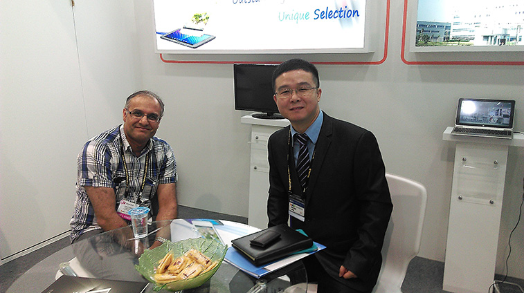 本次展会,我司主推8寸4G (FDD-LTE) 通话平板电脑,此款产品搭载MTK8752 64位A53架构八核高效芯片处理器,采用三星PLS炫屏,以钢化玻璃后壳搭配红色装饰条,外观时尚,性能出众,产品极具高端品味,深受新老客户青睐。此外,我司还展出了8.9寸,11.6寸,12.2寸windows 8.1系统平板电脑,这些产品表现尤佳,也获得了诸多好评。