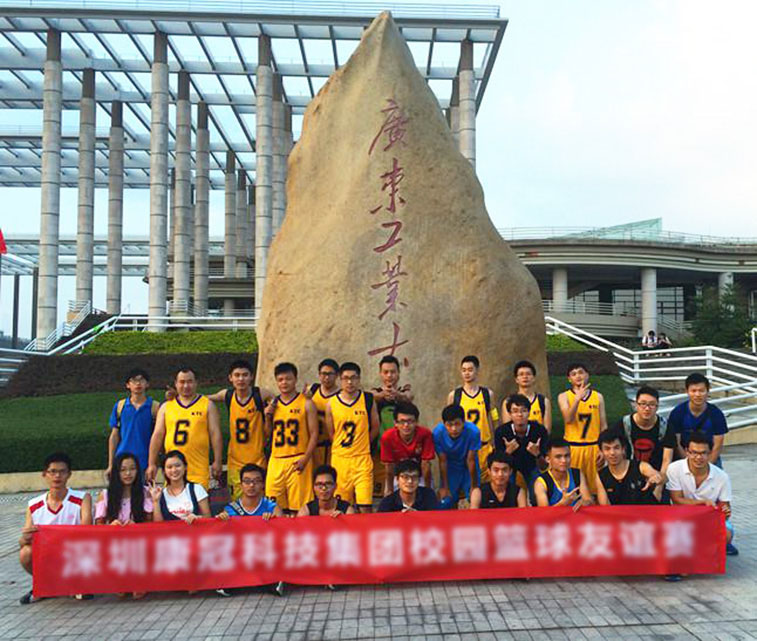 下午两点半,集团篮球队队员、大学生联盟队队员及啦啦队队员等27人一起来到广东工业大学C区篮球场,在双方队员相互握手后,友谊赛正式开始。