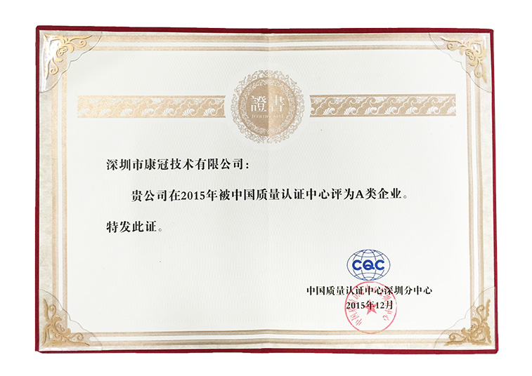 2015年12月,我司荣获中国质量认证中心(CQC)深圳分中心颁发的“A类企业”证书,说明我司企业管理完全符合CQC要求,并一次性通过审核,且无任何不符合项,同时也表明我司属于产品质量稳定且管理水平较高的企业。
