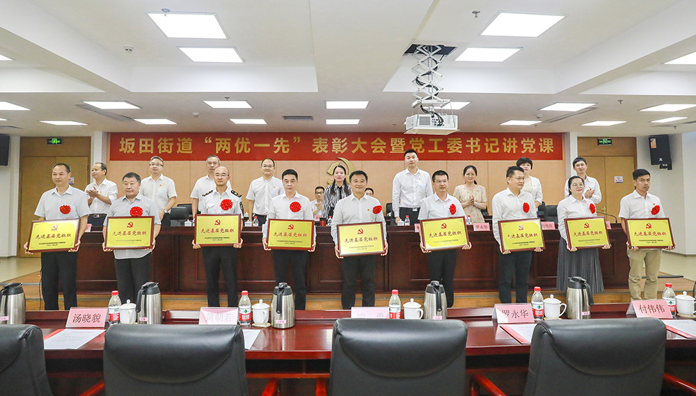 在表彰大会上,街道办领导通报了坂田街道获省、市、区“两优一先”表彰情况,并宣读《中共深圳市龙岗区坂田街道工作委员会关于表彰优秀共产党员、优秀党务工作者、先进基层党组织的决定》,随后,街道领导为街道省、市、区“两优一先”表彰对象佩戴了红花、进行了颁奖。