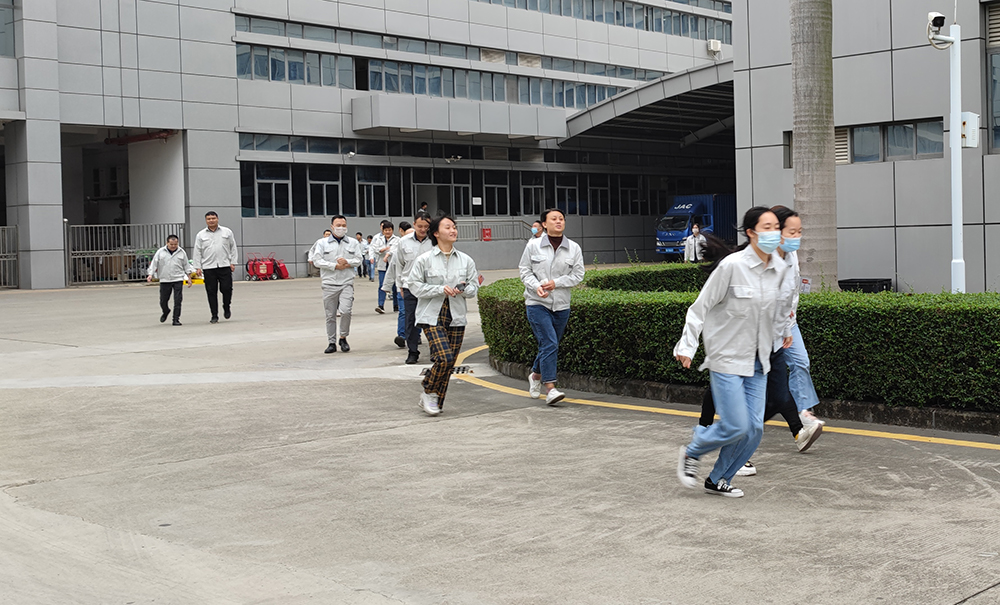 下午15:30警报铃声响起,在各楼层疏散组消防负责人的引导下,员工们从安全疏散通道撤离,跑向安全区域篮球场。公司应急小组义务消防队员同步出发,手抬担架进行抢救救护伤员演练。