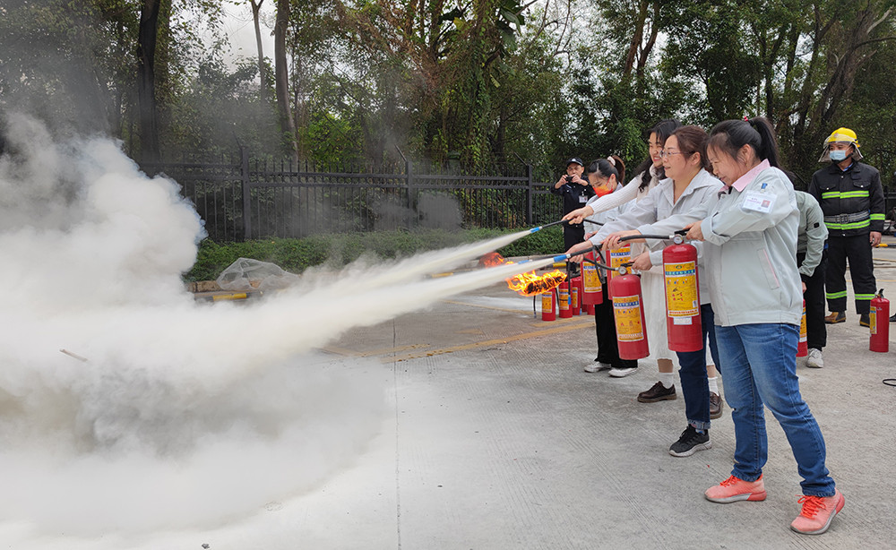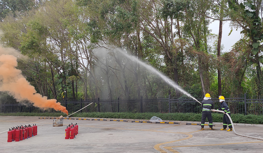 随后,辜主管向员工介绍了灭火器的种类及其使用方法,公司义务消防队员使用消防高压水枪射水模拟了扑灭火灾的详细过程。最后,公司义务消防队员们现场演示了使用手提干粉灭火器的要领,在他们的指导下,员工们拿到灭火器,先上下颠倒摇晃使干粉松动,再拉出保险销,一手扶住喷管,对准火焰,一手压下压把,完成了灭火实践。