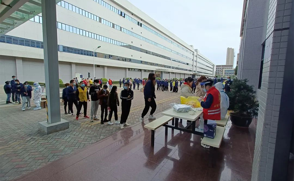 在园区全员核酸检测现场,志愿者们有序地维持现场秩序,耐心讲解核酸检测申报流程、协助采集受检人员二维码,保障核酸检测工作快速有序开展。