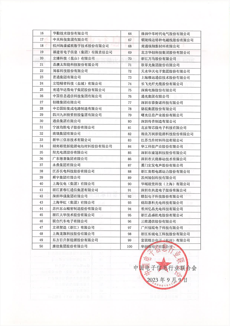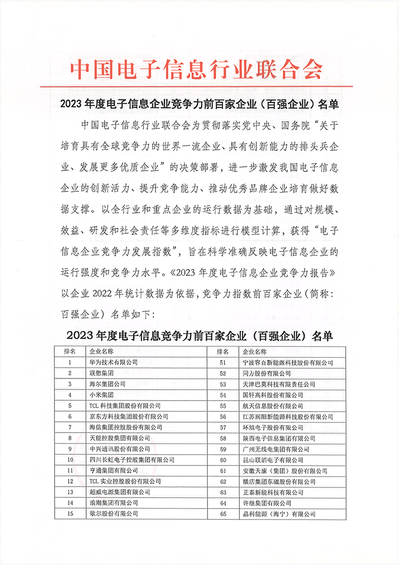附:2023年度电子信息企业竞争力前百家企业(百强企业)名单