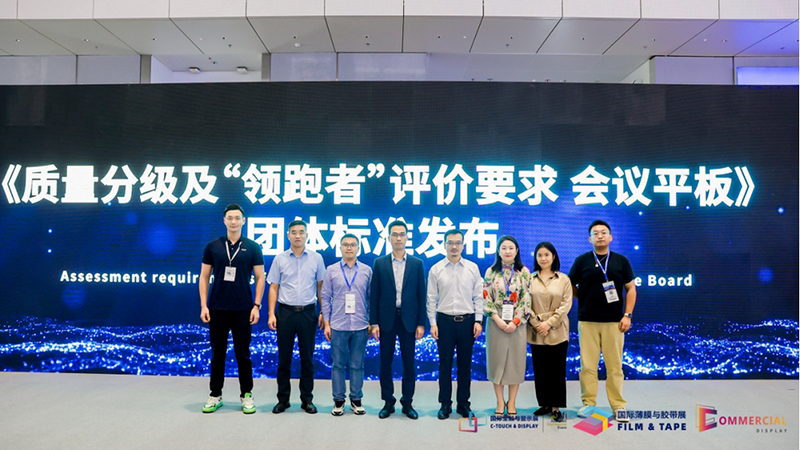 会议现场,中国电子视像行业协会与视源、京东方、海康威视、海信商用、长虹、皓丽、洛图科技等企业代表共同启动了《“领跑者”评价要求会议平板》标准的发布仪式。