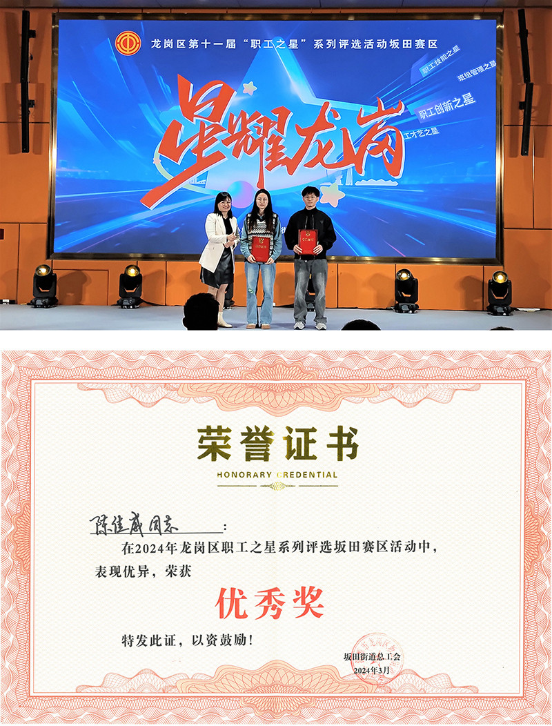 工程师陈佳威在龙岗区“职工之星”系列评选活动坂田赛区荣获“职工技能之星”优秀奖。