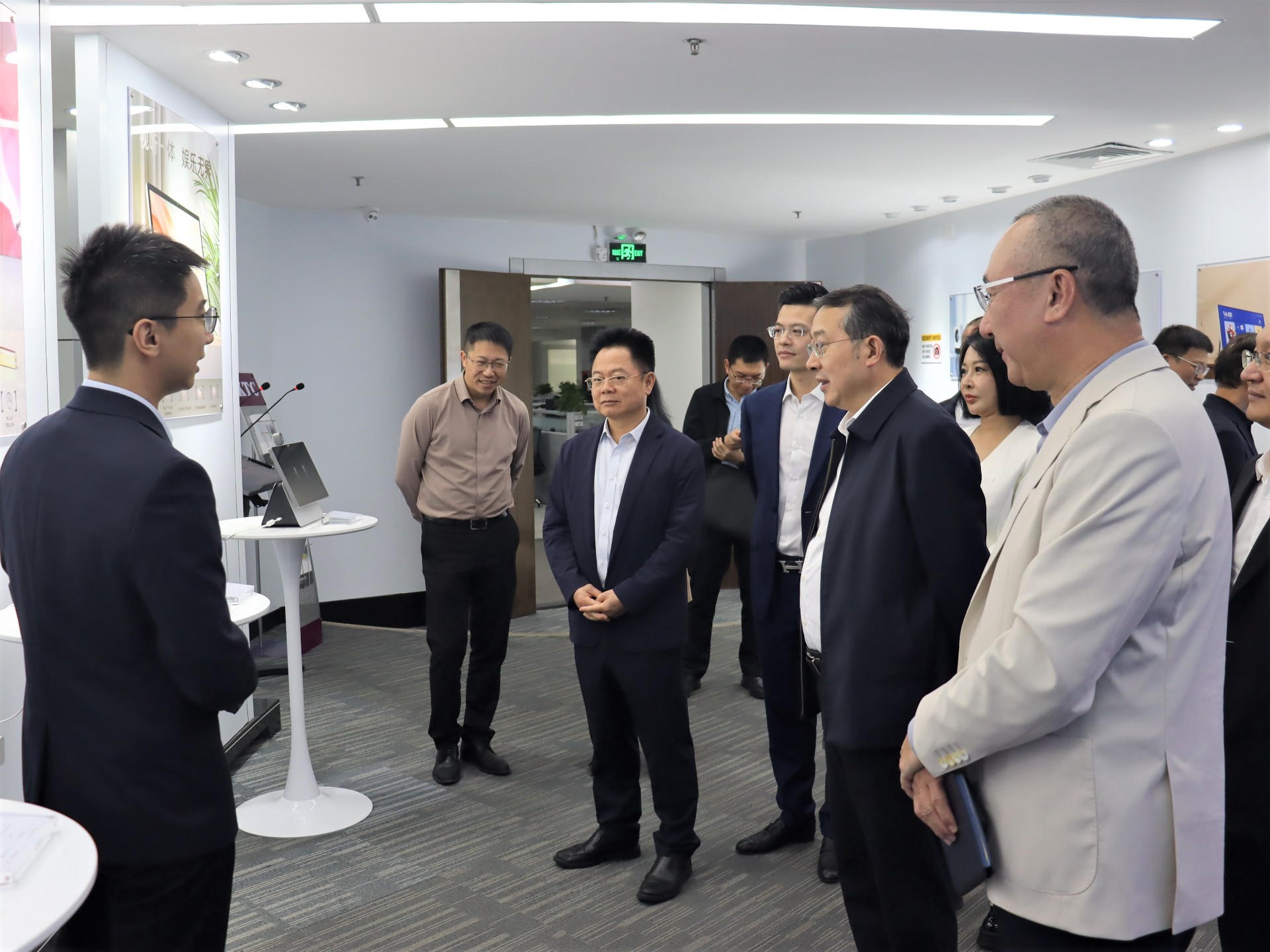 在凌斌董事长的陪同下,王强部长一行首先参观了园区模型与产品展厅。公司负责人详细介绍了银河集团(galaxy)在智能显示终端领域的核心产品、技术创新成果及市场应用情况。王强部长仔细了解产品性能及应用情况,对银河集团(galaxy)坚持自主研发,不断丰富产品矩阵表示高度肯定,对在高端制造和全球化布局中取得的成绩给予肯定。